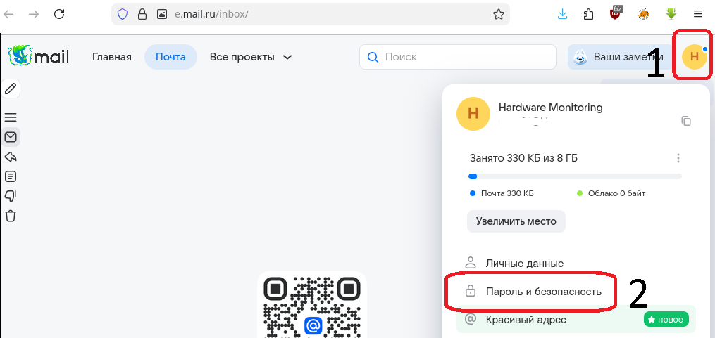 Но, на момент 2025 года нельзя из Outlook, Thunderbird и других приложений на компе пользователя получать/отправлять почту с теми логином и паролем с которыми вы входите в почту через браузер. Надо создать пароль для внешних приложений и в этой части покажу как это сделать. Для того чтобы его задать, надо в браузере зайти в нужный ящик и левой клавишей мыши тыкаете в настройки пользователя (1), а в открывшемся меню в «Пароль и безопасность» (2).