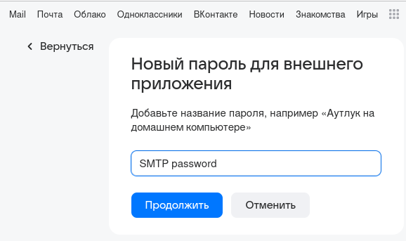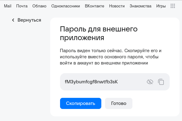 Здесь, вместо password123 вписываем созданный в первой части пароль для внешних приложений.