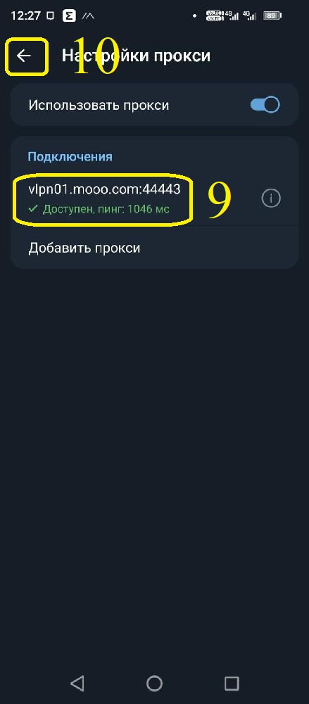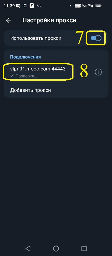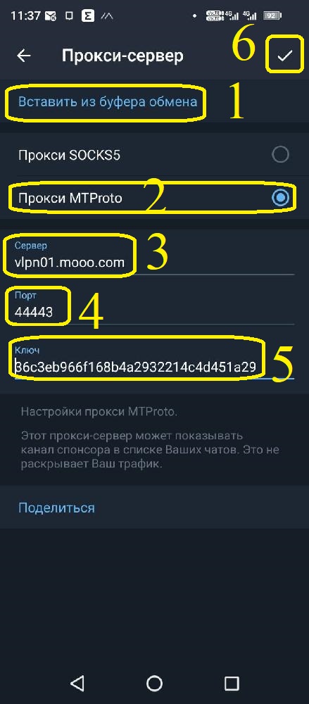 В меню настроек прокси-сервера нажмите на строку "Вставить из буфера обмена" (1). Должны обновиться пункты 2-5 как показано на картинке. Нажмите на галочку "Принять" (6). Переведите ползунок вправо (7), должна появиться надпись "Проверка" и через секунду-две надпись изменится на ту что в пункте 9.