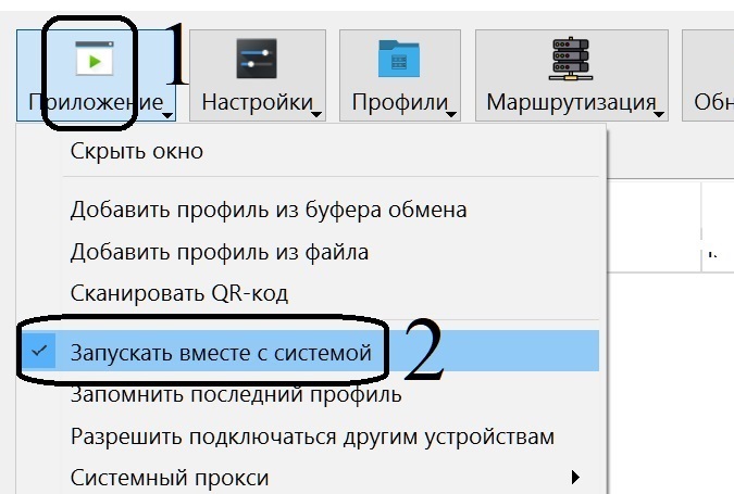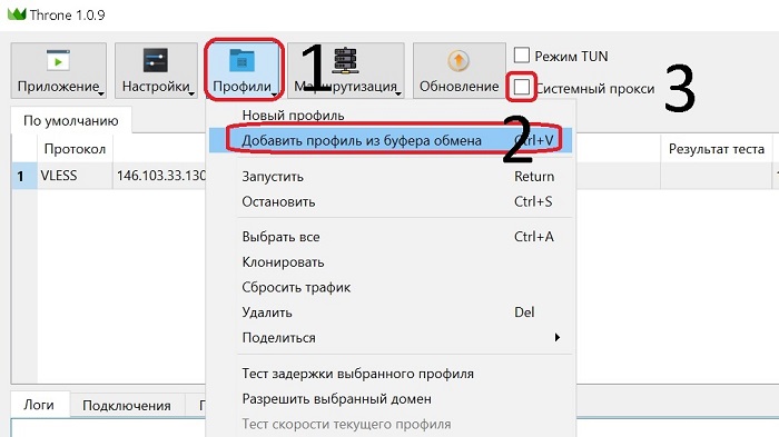 Скопируйте в буфер обмена строку для подключения к серверу. Затем в программе нажмите на "Профили" (1), затем на "Добавить из буфера обмена" (2) и отожмите галку "Системный прокси" (3).