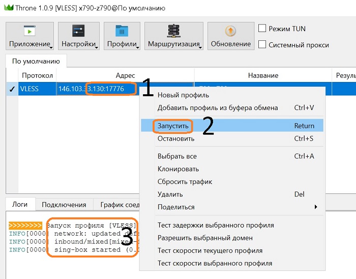 Затем правой клавишей мыши щёлкните на строке подключения к серверу (1) и левой клавишей нажмите "Запустить" (2). В поле логов (3) будет показан процесс подключения к серверу.