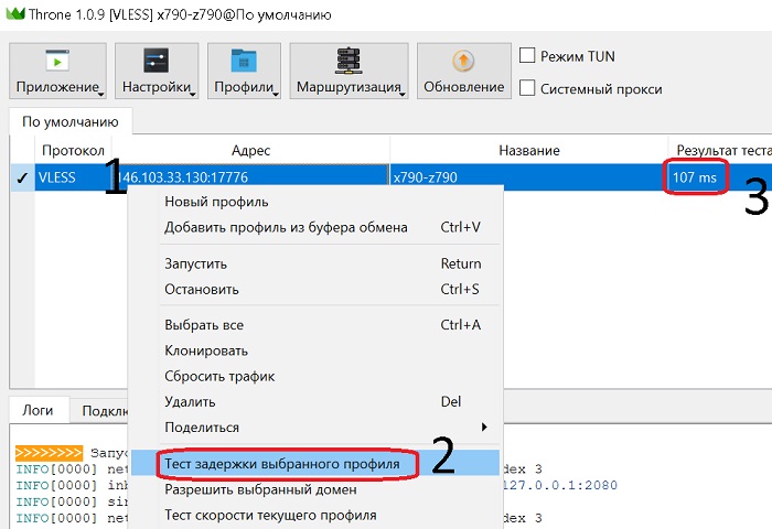 Затем снова щёлкните правой клавишей мыши на строке подключения к серверу (1) и левой клавишей нажмите "Тест задержки выбранного профиля" (2). В поле Результат теста (3) будет показана задержка в милисекундах (ms). До 200 ms нормально.