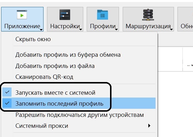 Затем надо настроить автоподключение программы при запуске. Для этого щёлкните по кнопке "Программа" и в открывшемся меню щёлкните по "Запускать вместе с системой"